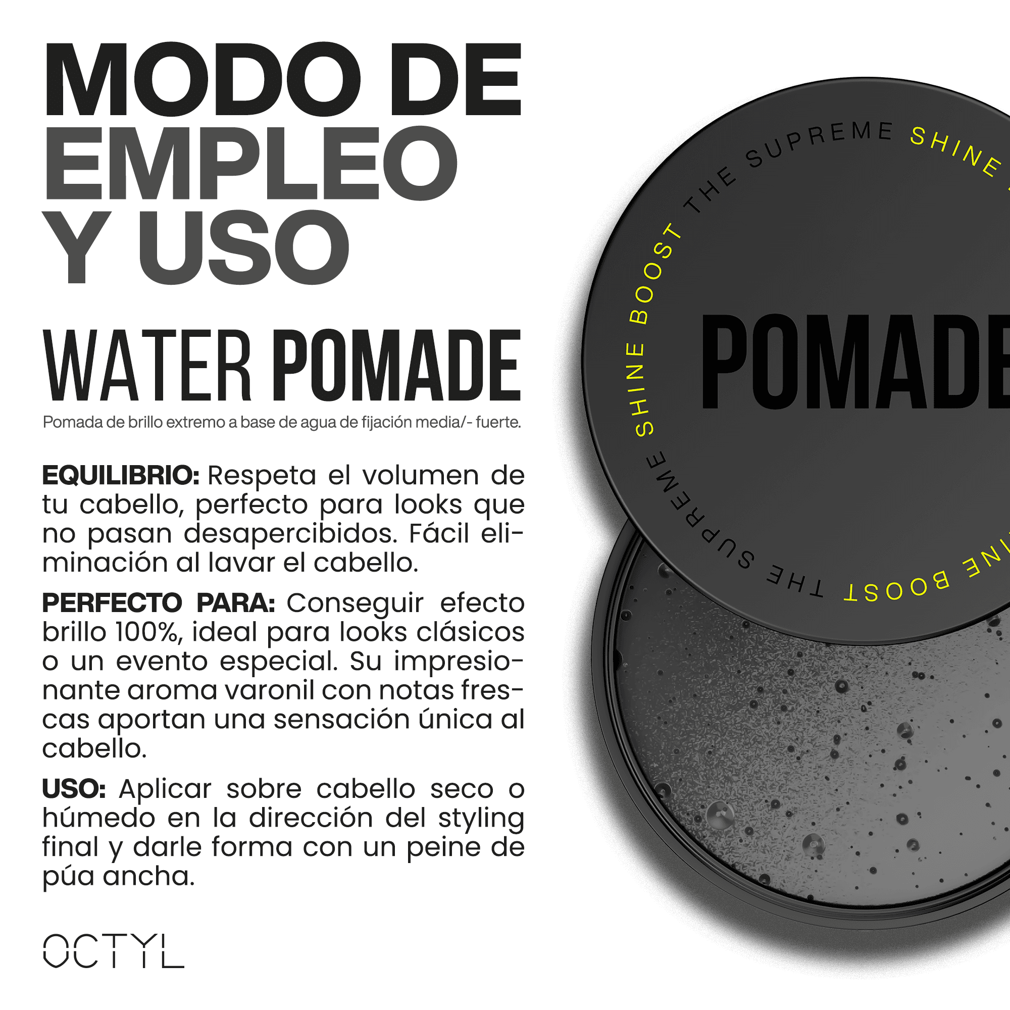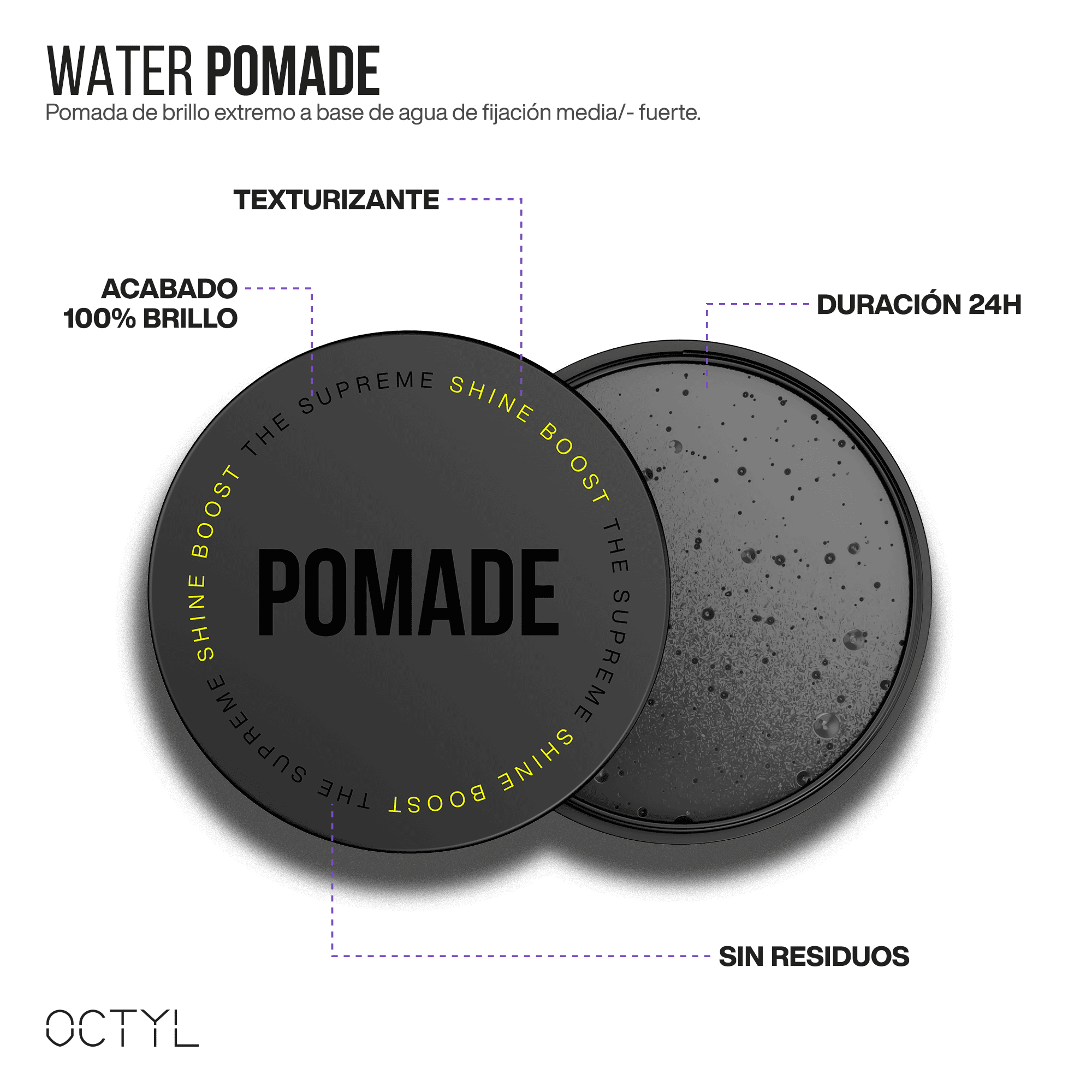 Water Pomade de OCTYL es una pomada profesional de brillo extremo formulada a base de agua,